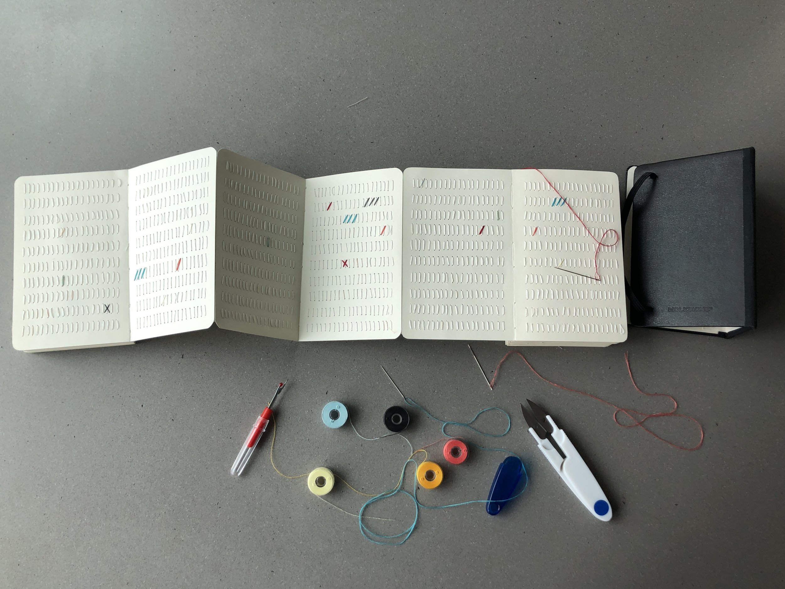 To begin, I disassembled three whole Moleskine notebooks, and then re-assembled their pages in an accordion. I then stitched the pages with thread—14,496 stitches to be exact, one for each day of my life on this earth until now. The color of the thread is white, almost the exact same color as the paper itself. The stitches are almost imperceptible.