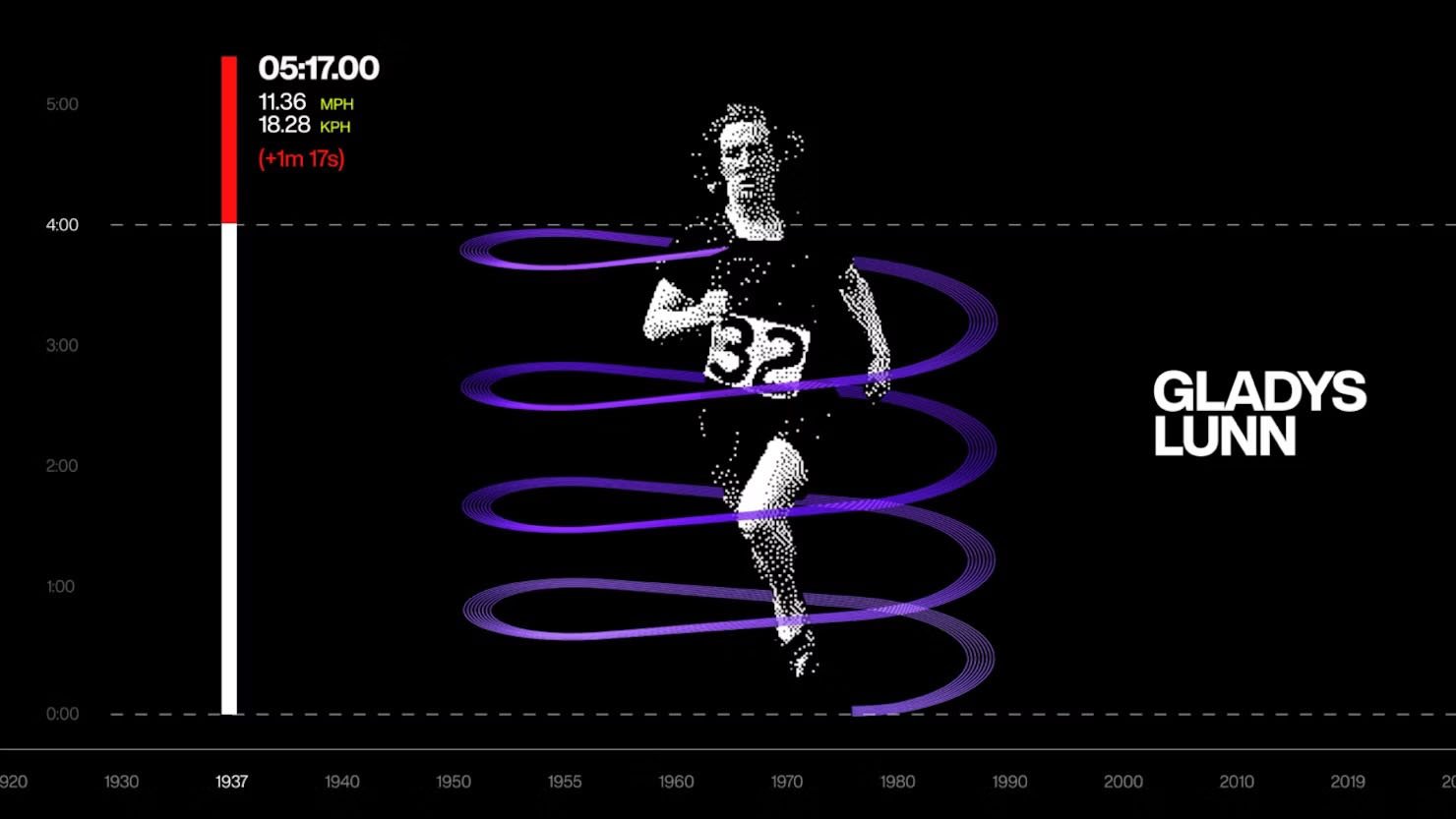 In another video, historical time is also invoked, with the spiral visually linking Faith’s attempt to the mile as a universal athletic benchmark. Kipyegon is the only woman runner positioned to break the 4-minute barrier at this point, but she is not the first woman to redefine the limits of women’s athletic abilities. Underscoring the effort behind Faith and Nike’s partnership are other female runners throughout history who have challenged the impossible.