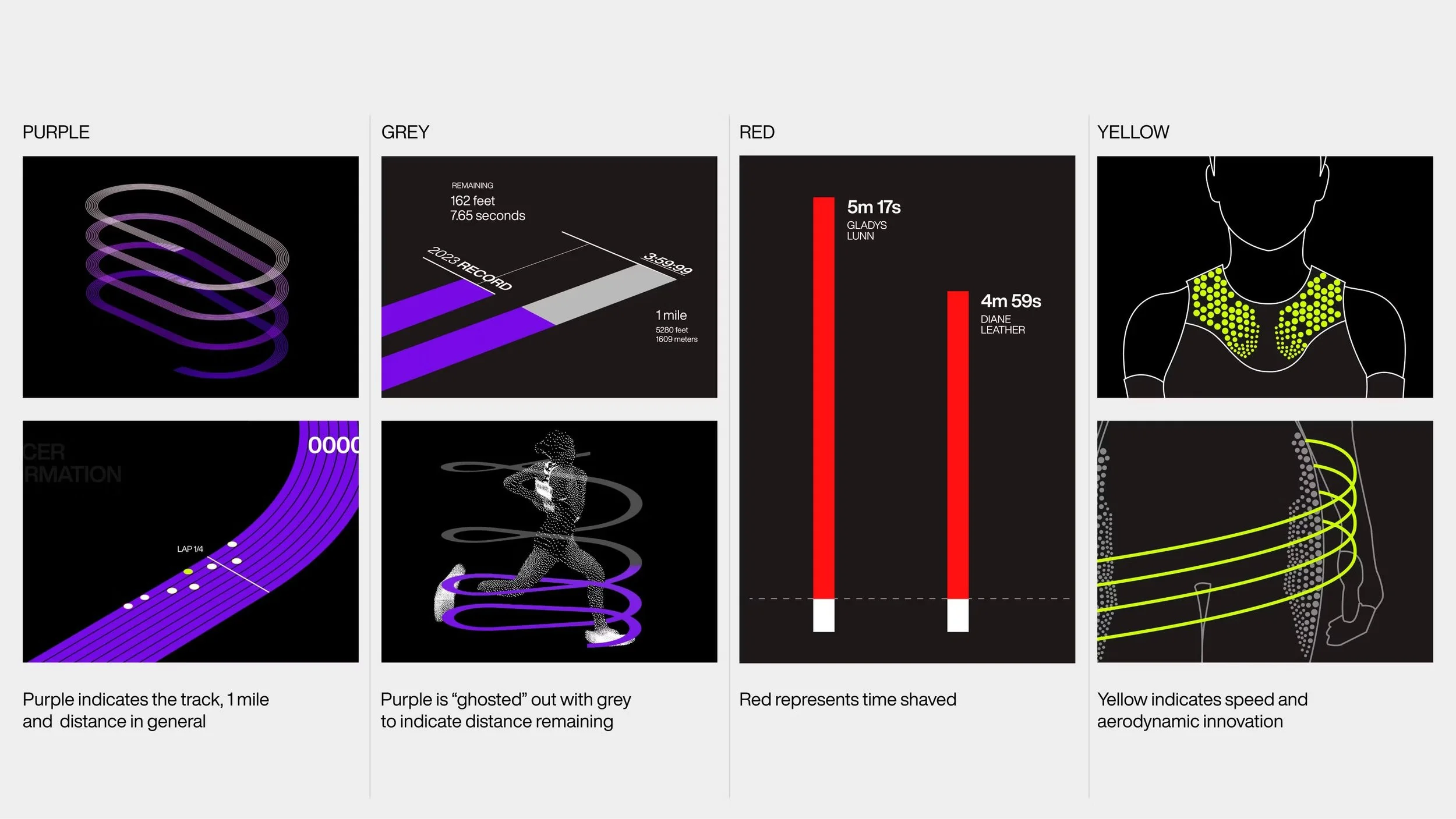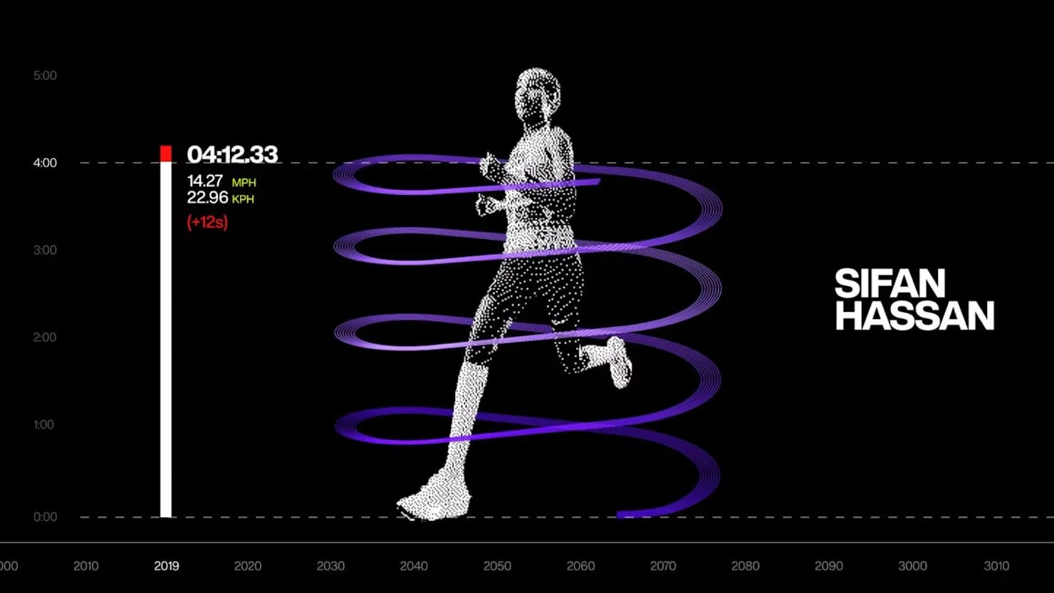 Faith Kipyegon, the current female world-record-holder in the mile, is pursuing a previously unimaginable feat: running a sub-four-minute mile. Nike, Kipyegon’s longtime partner, is helping to make Faith’s bold dream a reality — much like its collaboration with Eliud Kipchoge to break the 2-hour marathon record. Faith is working to shave nearly 8 seconds off of her 2023 record through a combination of training, carefully calibrated pacer formation, and breakthrough apparel innovations. Nike came to Pentagram partners Giorgia Lupi and Eddie Opara to develop a data-driven visual language and series of assets for their larger Breaking4 campaign, specifically to highlight the science behind this audacious moonshot and inspire future generations of female athletes.